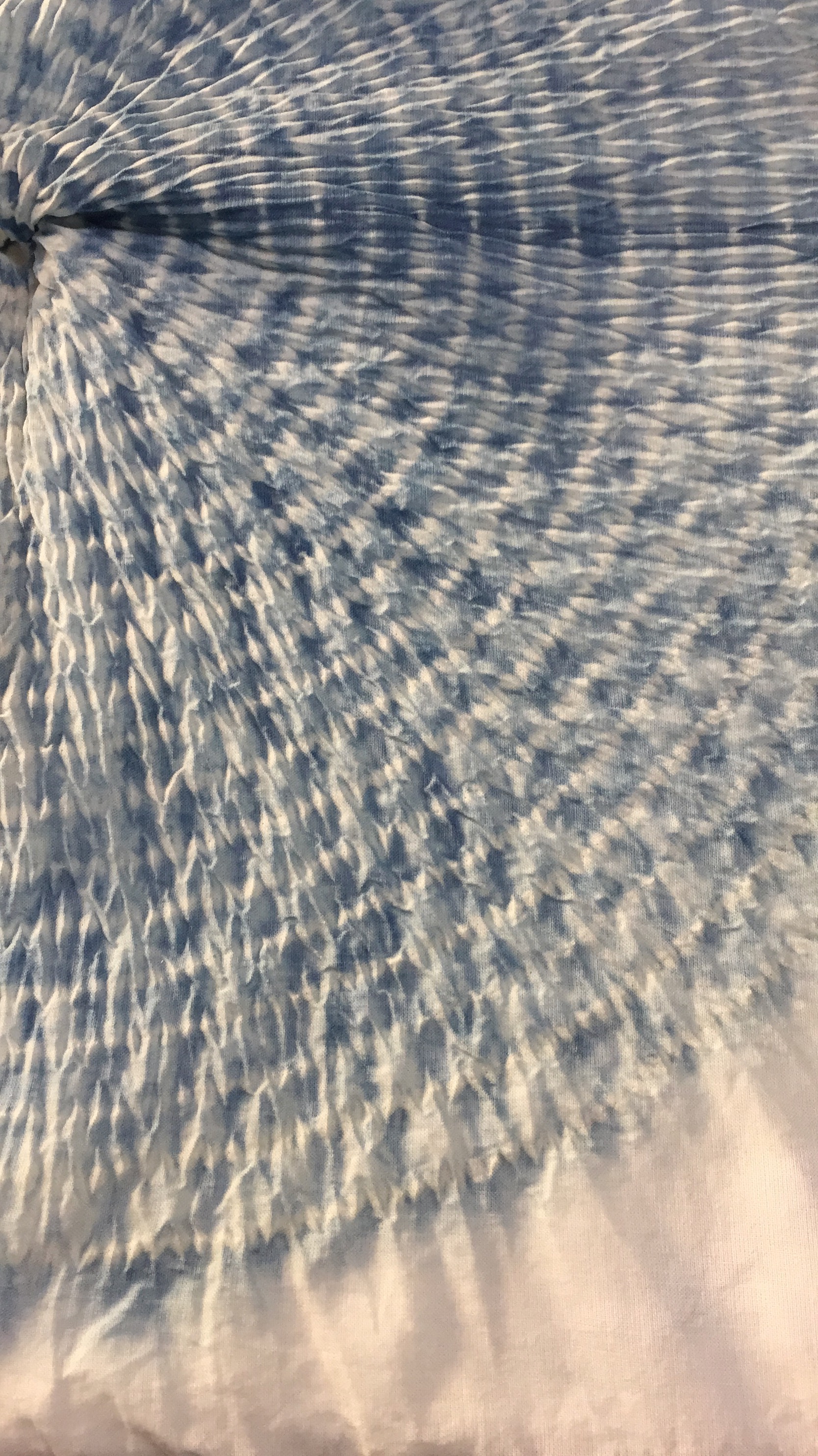 12月11日から藍建が始まり、27日に絞りを解凍〜自分の作ったスクモを使い、灰汁発酵建てで染めたもの。淡〜く染まりました。。。。。。この作品は今、自分のアトリエのエントランスで優雅に揺れています。