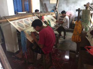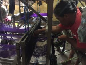 私たちのホテルから少し離れたところに中心地があり、遠いけど歩けないことはないし。。。ということで草履の足でペタペタ歩いて行って来た。地元の人が買いに来る、駄菓子屋さんや総菜屋さん、フルーツ屋さんがあったりする(人通りはあまりない)。その先に、織物を売っているお店を見つけた!入ってみると、下の階に工場があるという。みてきなツ!と言ってくれたので、早速見学。