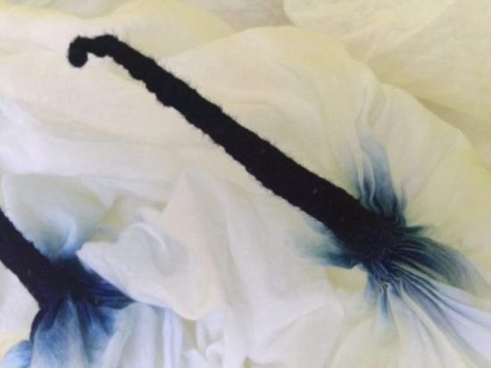 写真は手蜘蛛絞り。絞ったところだけ染めて、あとは白いまま。