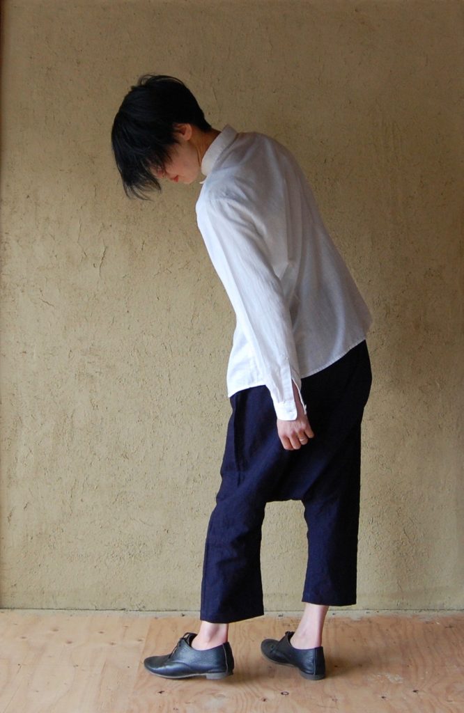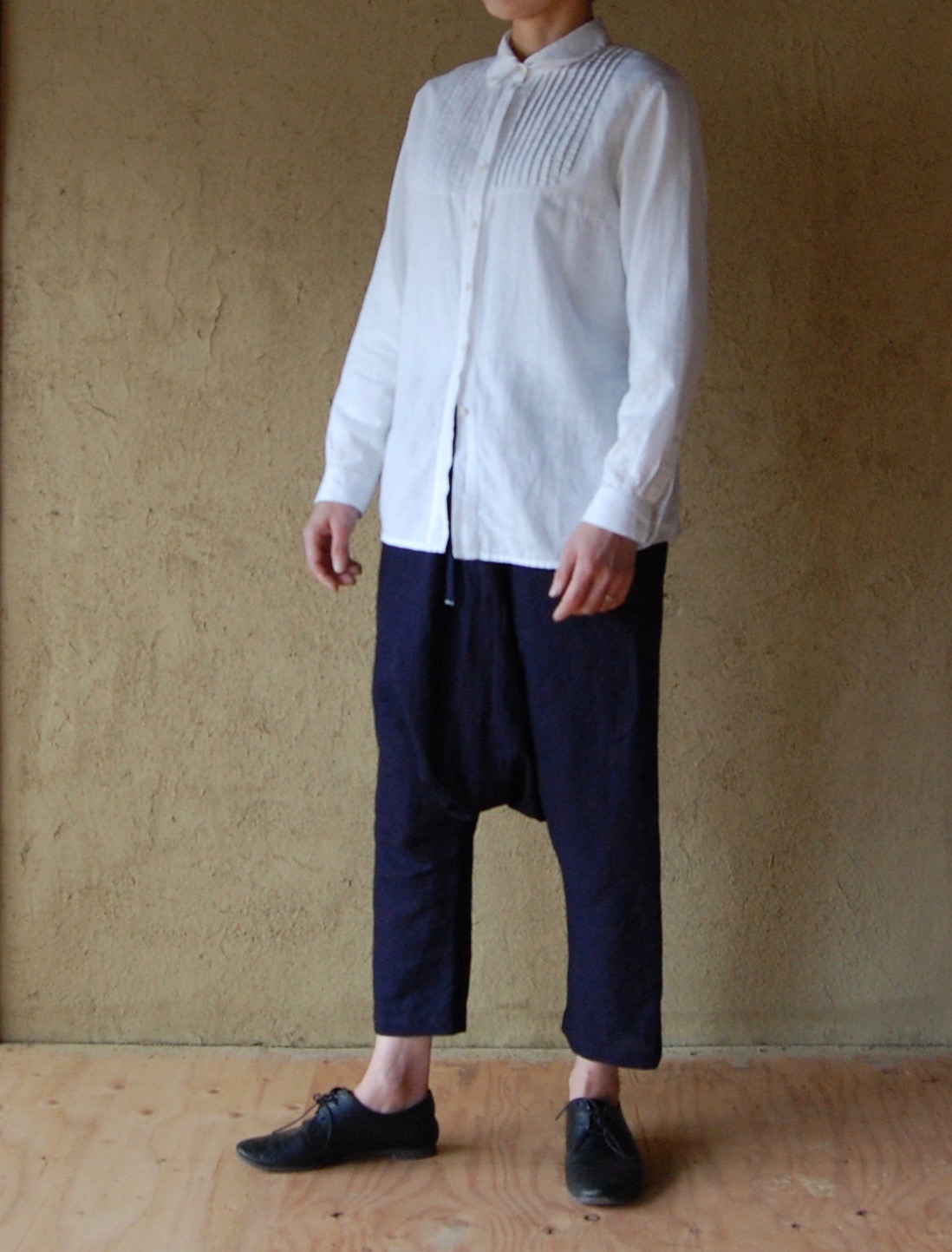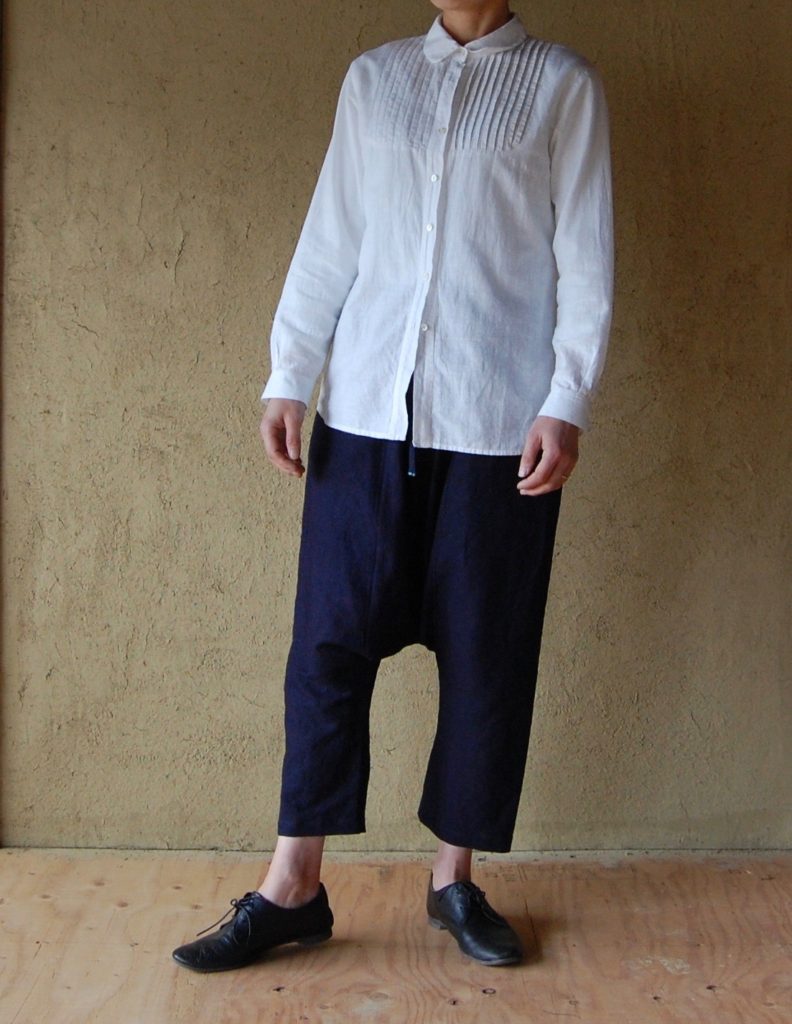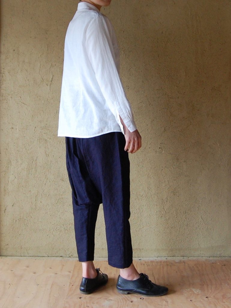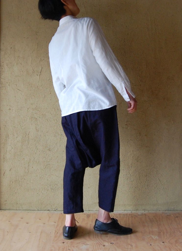 股上が長めのサルエルです。生地は綿麻で、ほのかな光沢があります。着心地は軽く、藍が綺麗に染まっています。