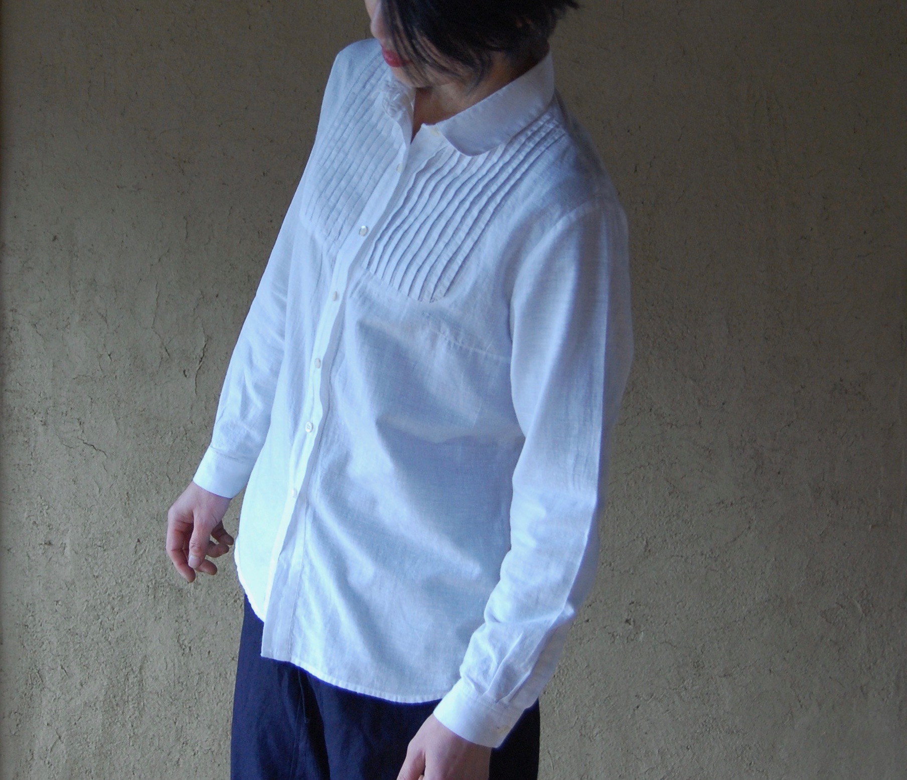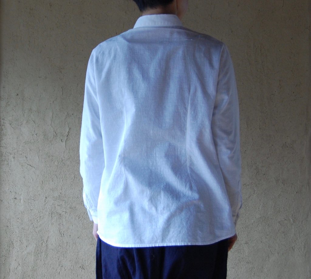 布はインドから参りました。西ベンガル州の村人たちの手作業により綿を紡ぎ、織られたものです。このシャツには細い番手を使っています