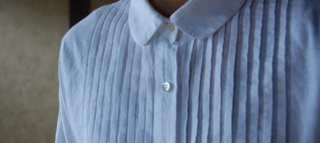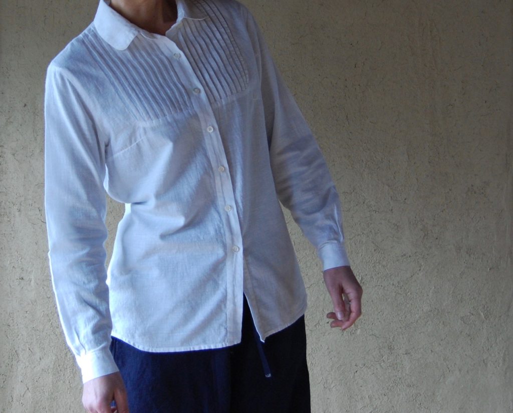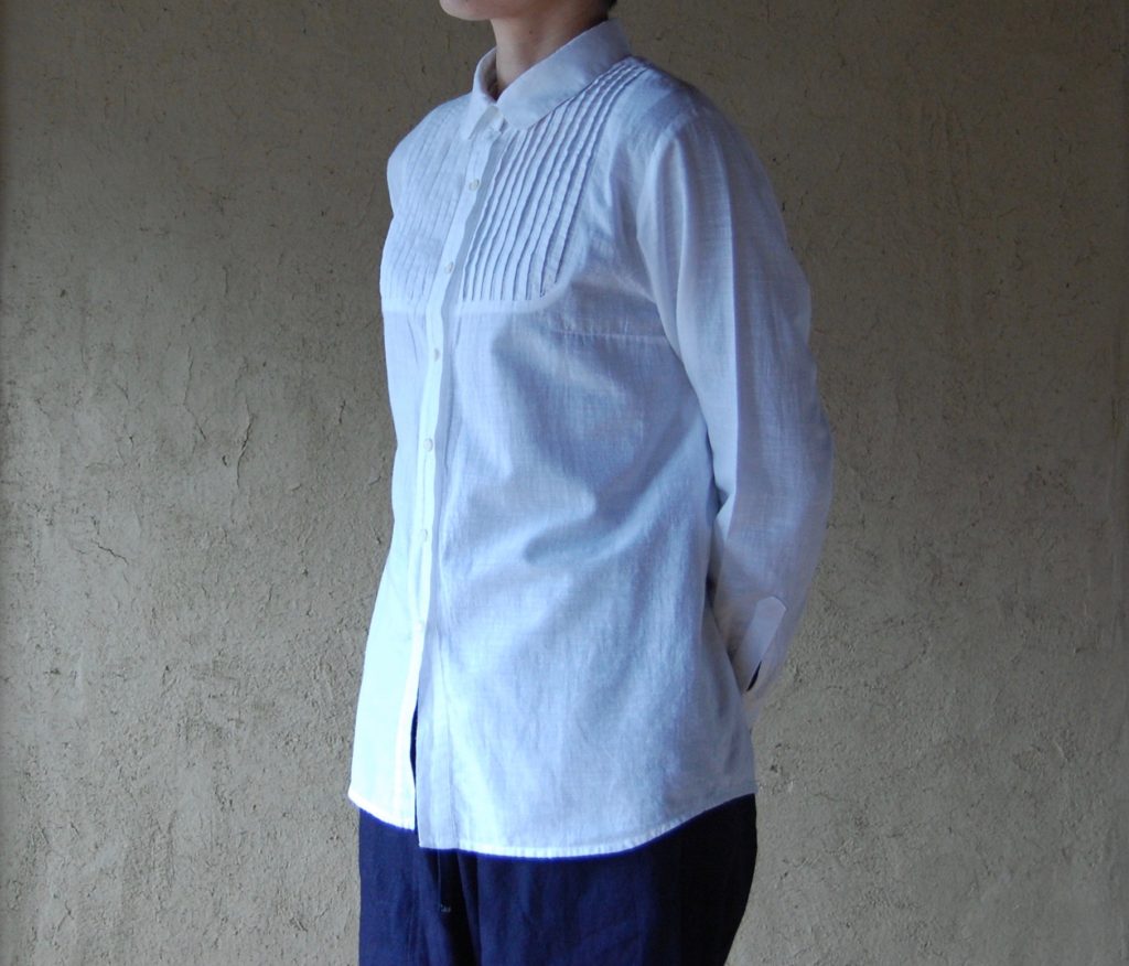 胸に細いタックを入れて、生地に立体感を作っています。若々しさのあるデザインですが、落ち着いた印象もあります。気に入っていただけたら、嬉しいです。