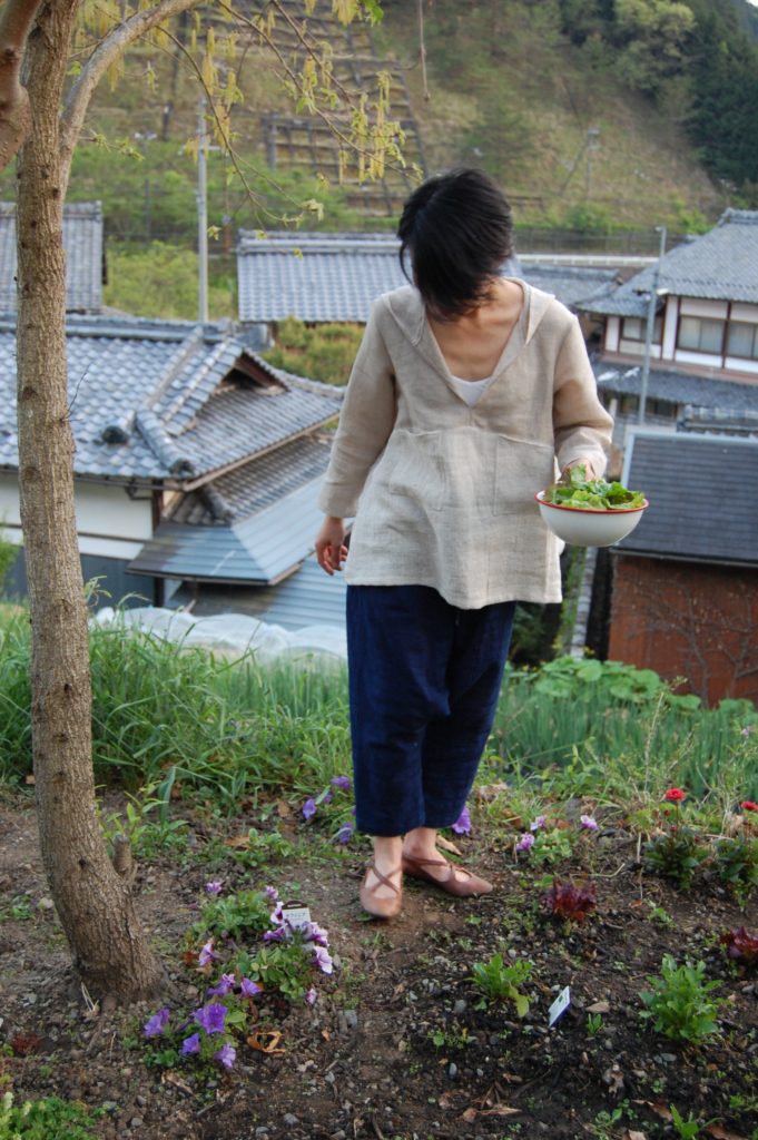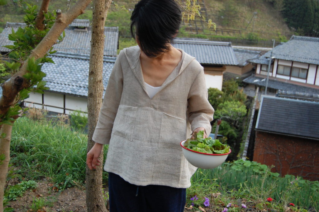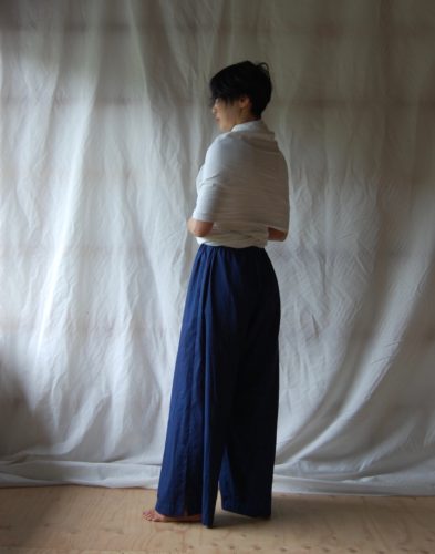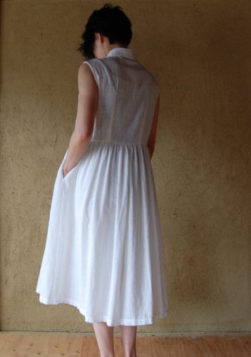 インドから取り寄せたリネン生地とリネンコットンの生地を組み合わせました。ざっくりとした印象のあるリネンコットン生地は、リネンとコットンを引き揃えて、手作業により紡ぎ織られたものです。着心地は軽く、気持ちよく風が体を通ります。