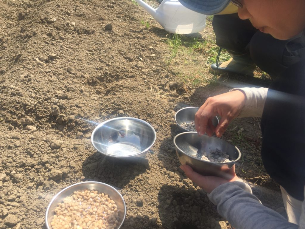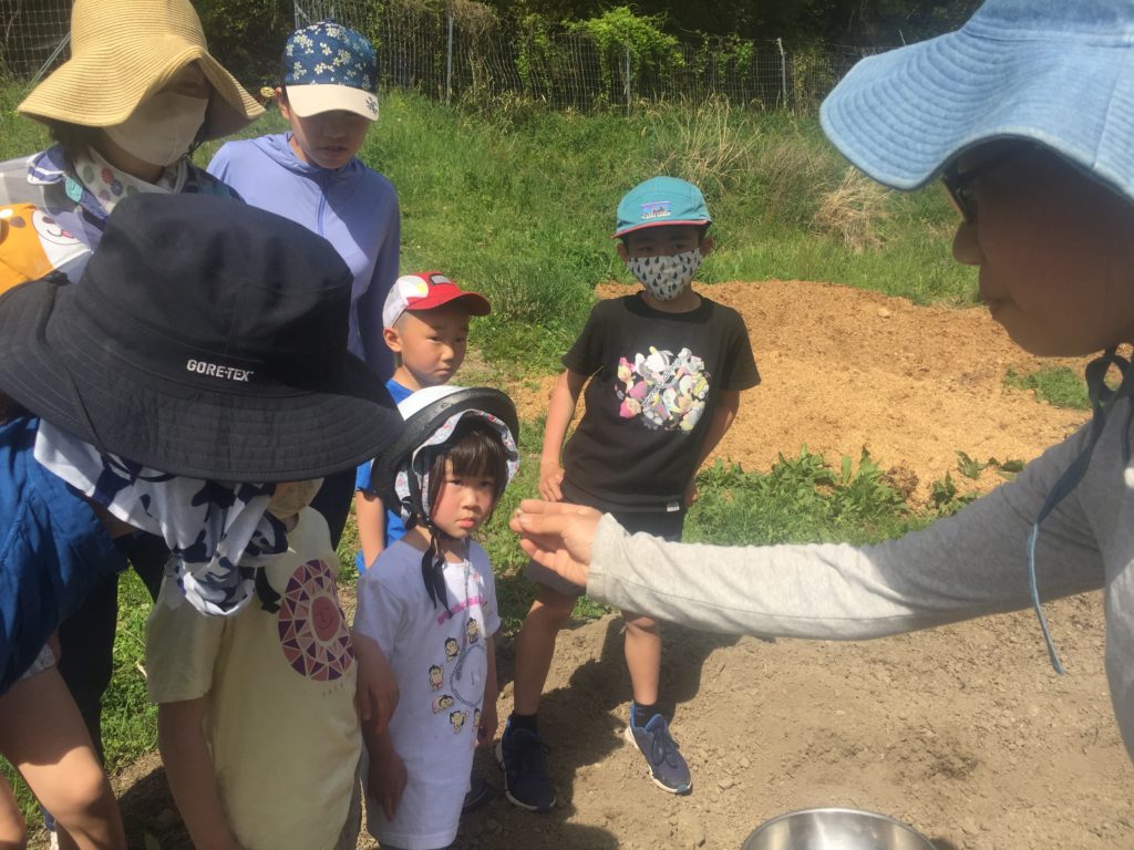 朝10時、静原のお墓へ行く途中の畑で、ワイワイガヤガヤ楽しく種まきが始まりました。地元の家族や近隣の地域の方々が参加されていました。この日みんなに説明をしてくれたのは途中の大苗さんです。