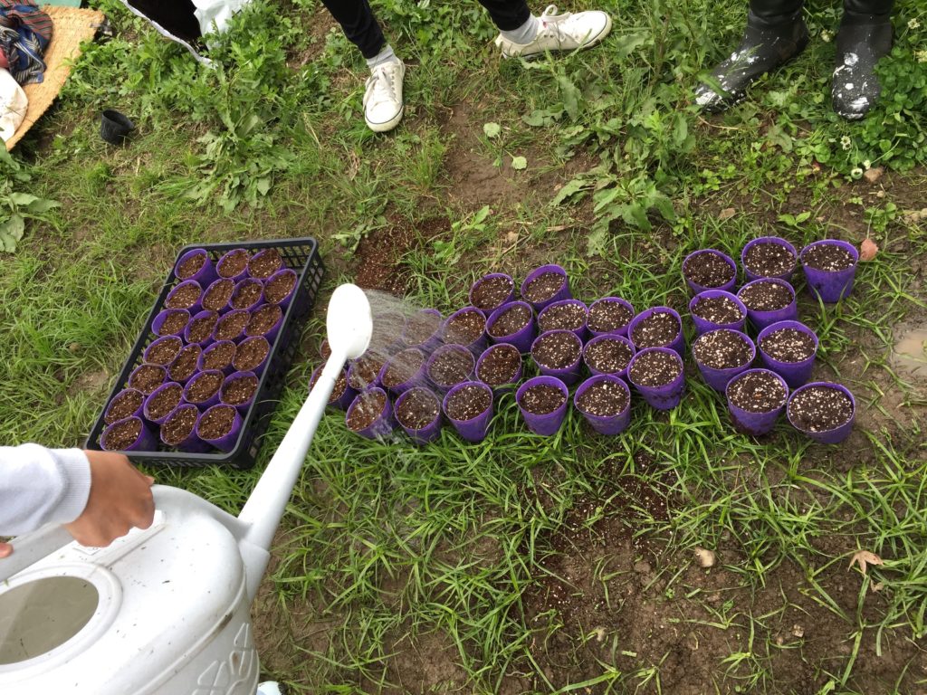 前回綿の種を畑にふた粒づつ撒きましたが、今回芽が出ていないところがあったので、ポットに種をまき、追加の苗の準備もしました。
