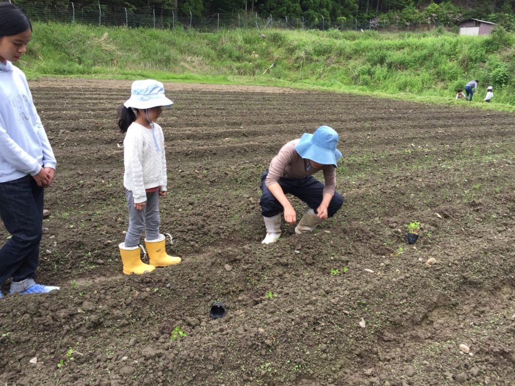 前回撒いた綿の苗の様子も見つつ、藍の定植をさせてもらいました。大苗さんの的確な説明にみんな聞き入っていました。お天気は曇りでしたが、作業をするにはちょうどよくて、参加した子供達ははしゃいで泥まみれになって、楽しそうでした。