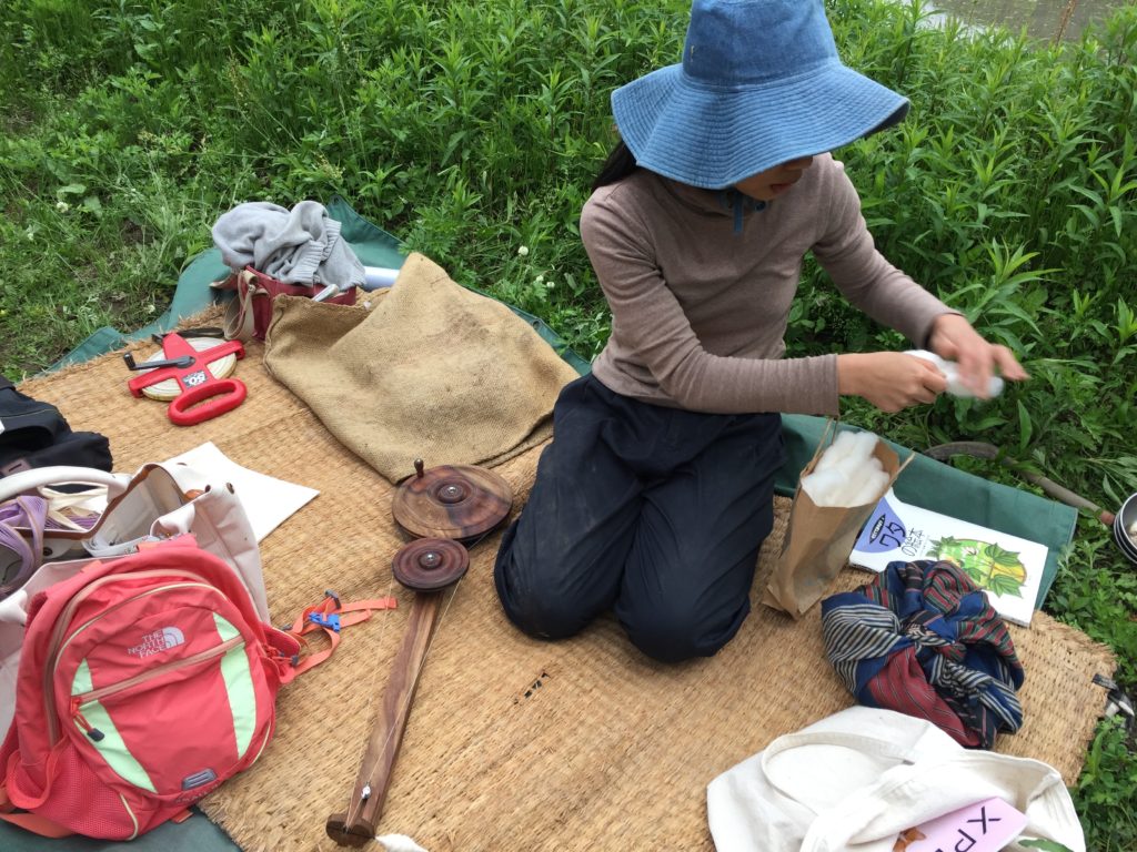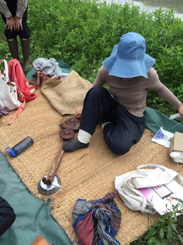 最後にチャルカでの糸紡ぎを見せてもらいました。大苗さんからはいろんな道具を見せてもらえます。チャルカは今まで見てきた糸車とはまた違う形で、壁にかけることもできそう〜と、みなさん見ていて楽しそうでした。