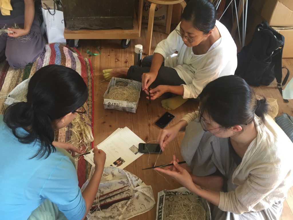 皆さん、熱心に取り組んでおられました。麻の織物の中に、横糸に葛のよりをかける前の平糸を織り込んだ織物をされている方、糸を細く裂いて、結んで長く繋げていく人、インド産のチャルカで糸によりをかける人。それぞれの仕事に集中しながらも、皆さんと色々なお話をしました。楽しい時間を過ごしました。