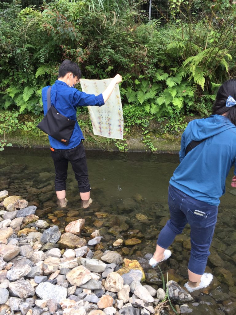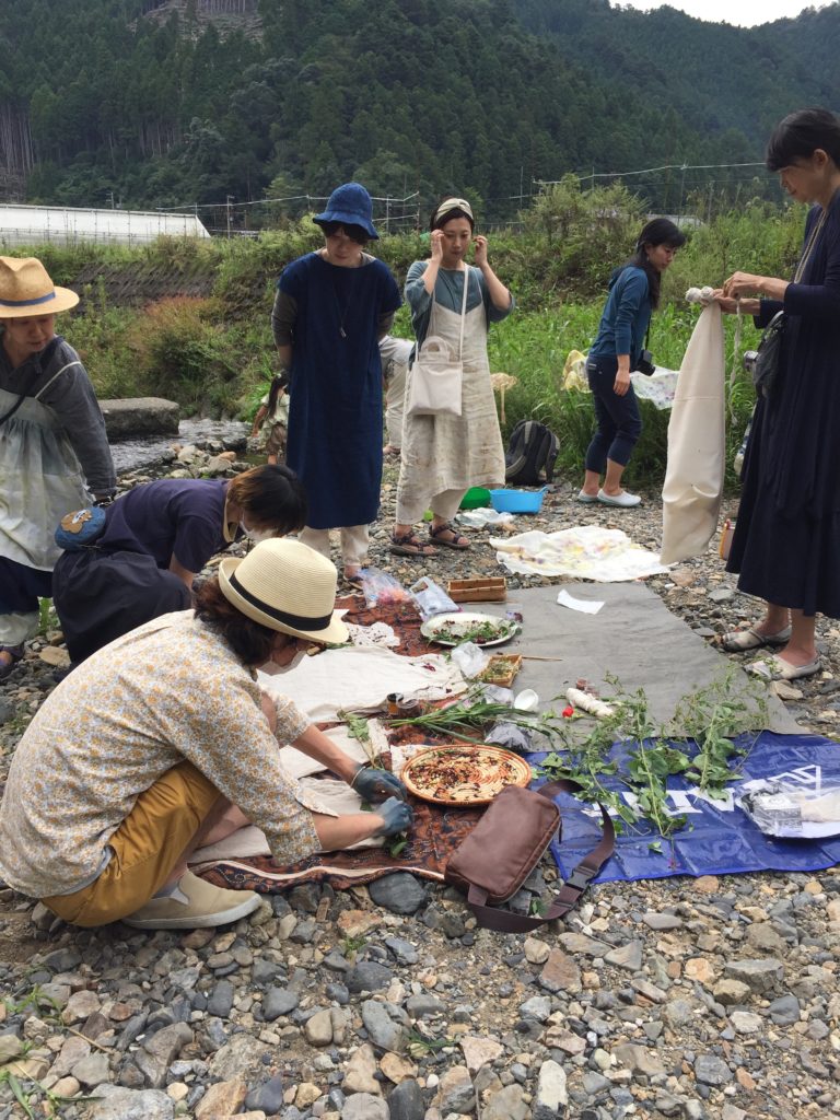 去年、私が初めて参加した花いろ染のワークショップが静原で行われることになり、参加しました。今年はたくさんの方が来られて、しずはらの河原で楽しく過ごしました。