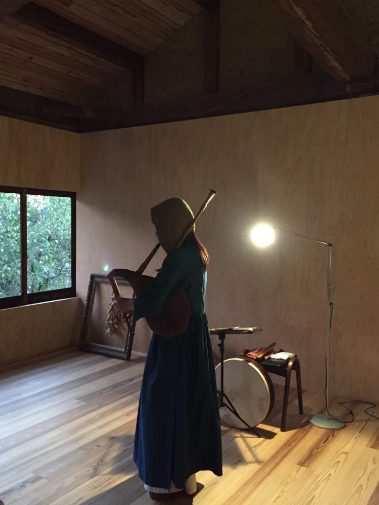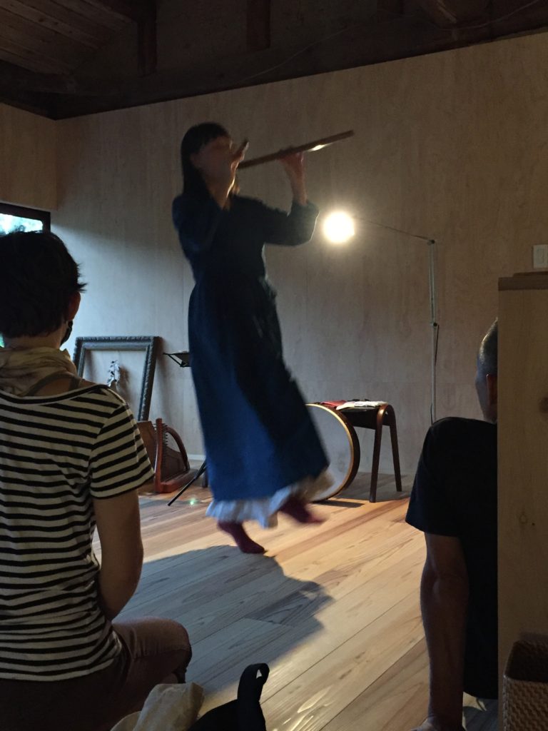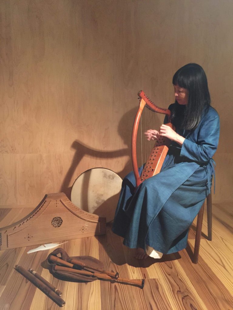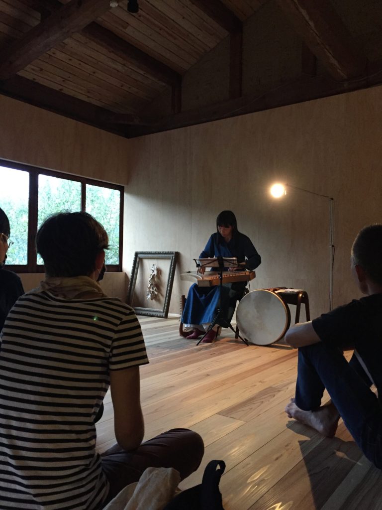 その後、古楽器を操るサリー・ランさんの演奏をみんなで楽しみました。手作りの楽器(プサルテリウム)やお月さまのような太鼓、笛、そしてバグパイプ。。。