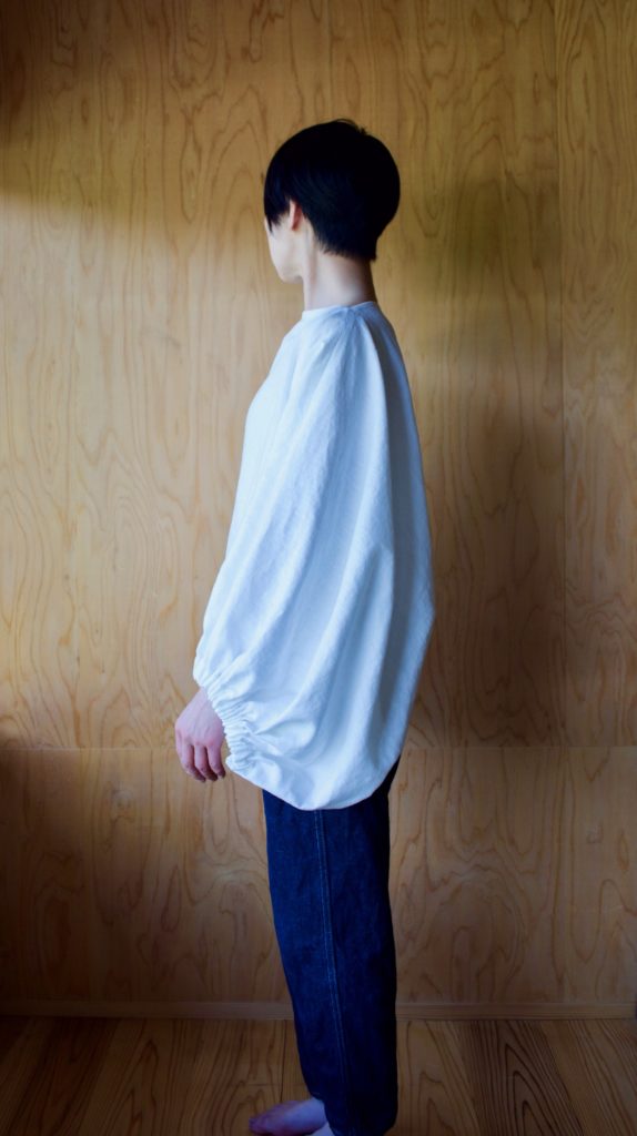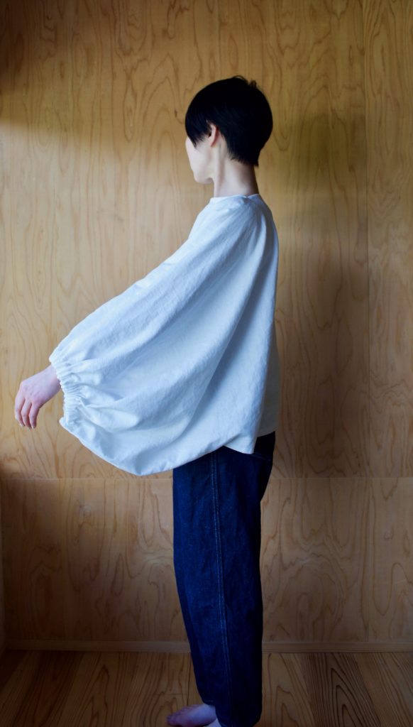 一枚の布を、どこも切り落とさず、切り込みとギャザーで仕立てました。