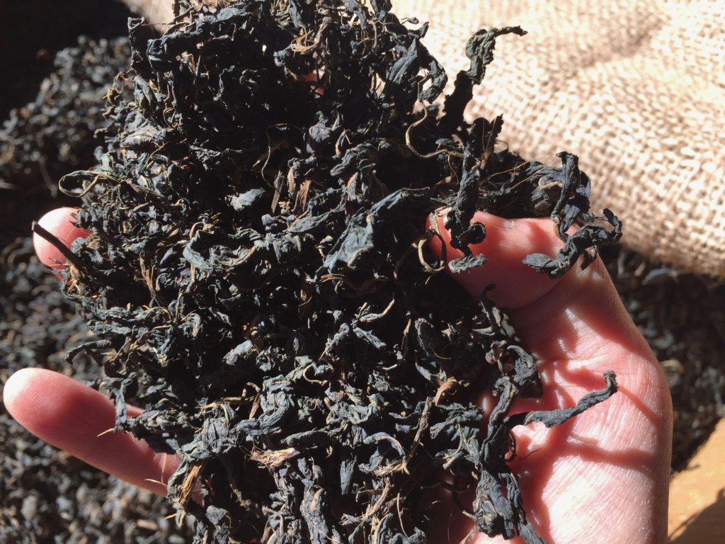 1番刈りと2番刈りを合わせ、もう一度葉を細かくして、茎や藍葉以外のものを取り除く…