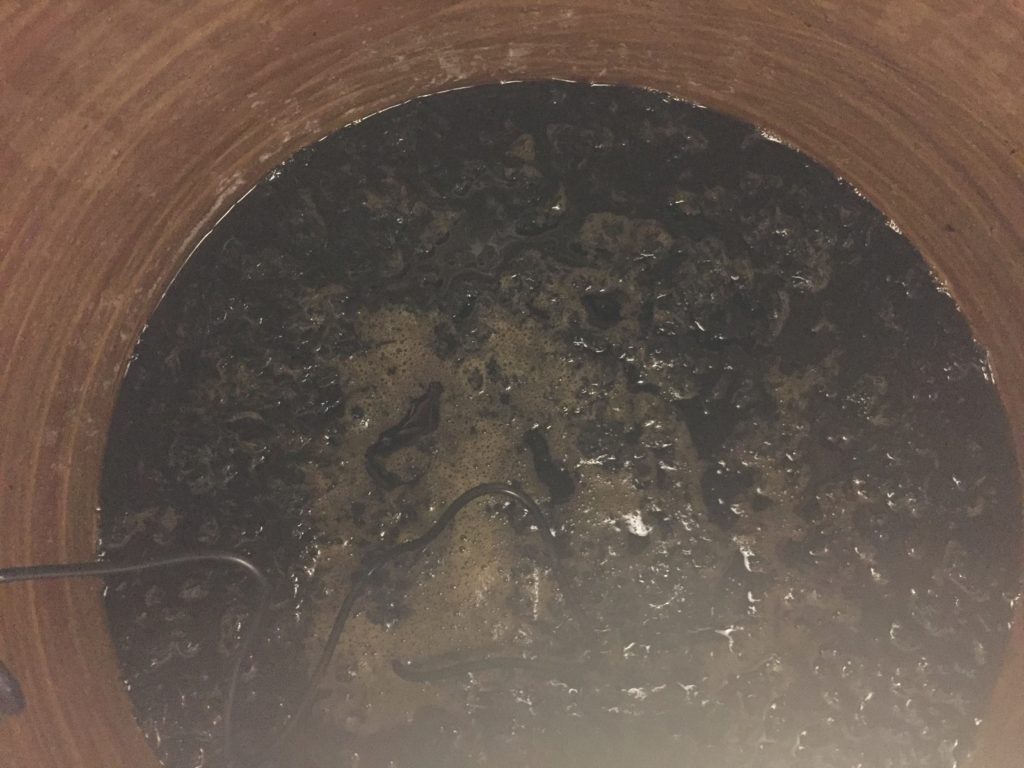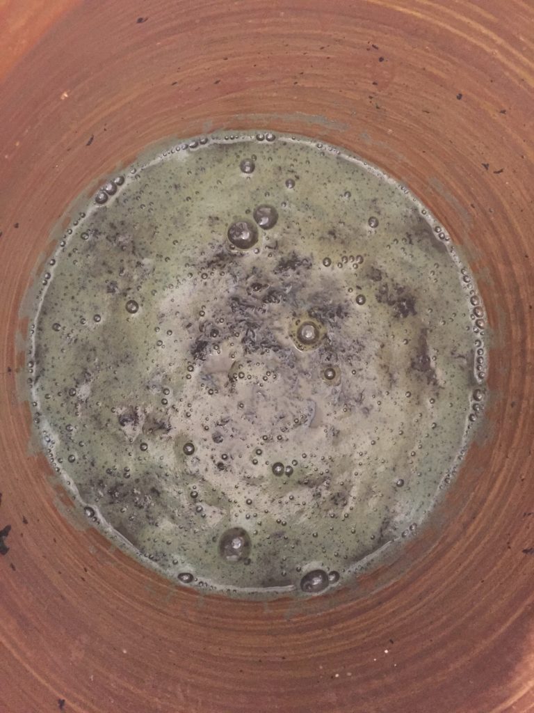 本日は藍建5日目。中石を入れ、様子を見ているところ。立っている泡の中にほのかな藍…